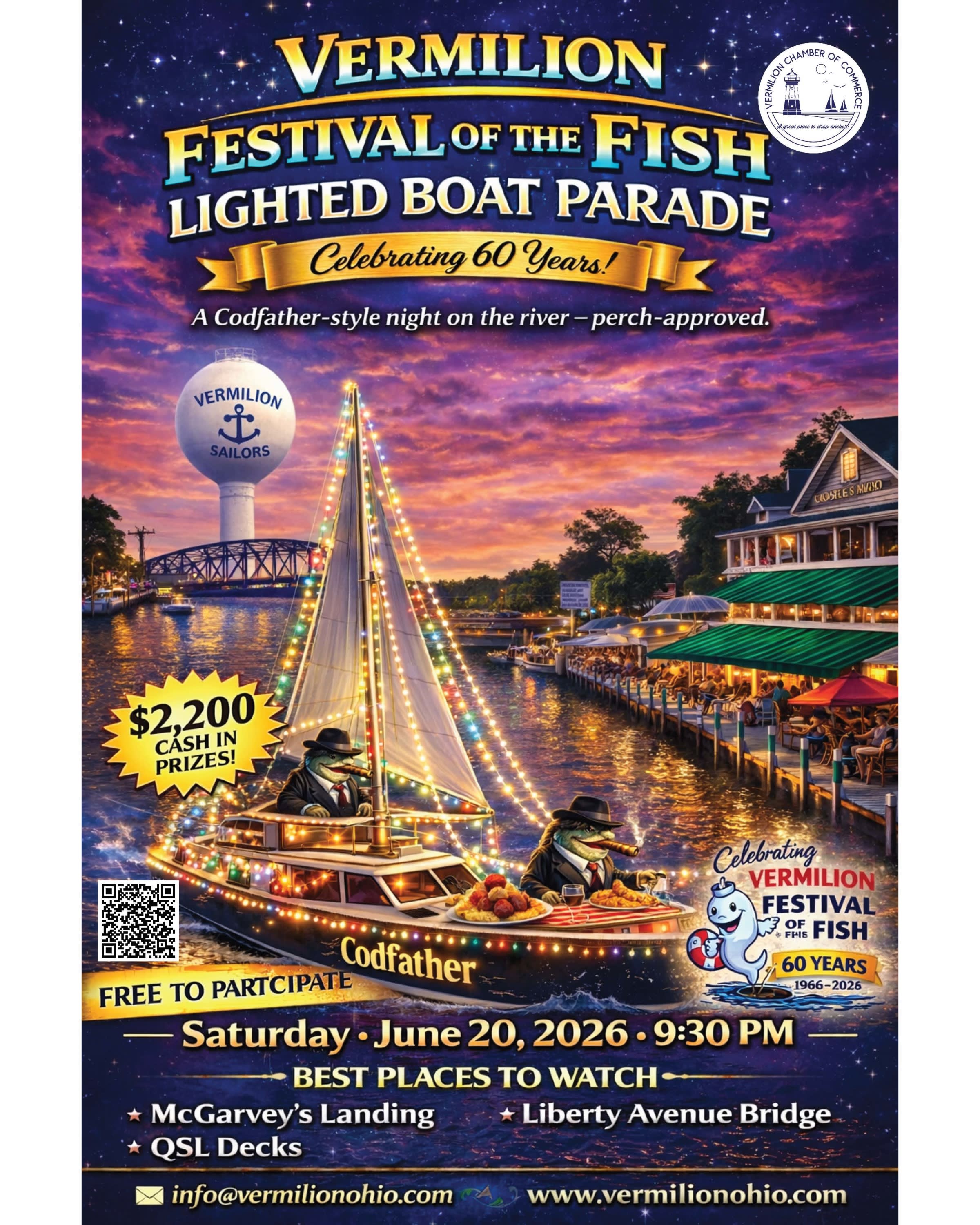 Parade Date: Saturday, June 20,2026 When: Dusk (approximately 9:30pm-10:00pm) Suggested Theme Mafia Fish Theme CASH PRIZES 1st Place 2nd Place 3rd Place Contact Info: Vermilion Chamber of Commerce 5495 Liberty Ave Vermilion, OH 44089 Phone: 967-4477 or Barb Flaczynski 419-681-4278 Fax: 440-794-3536 E-mail: info@vermilionohio.com