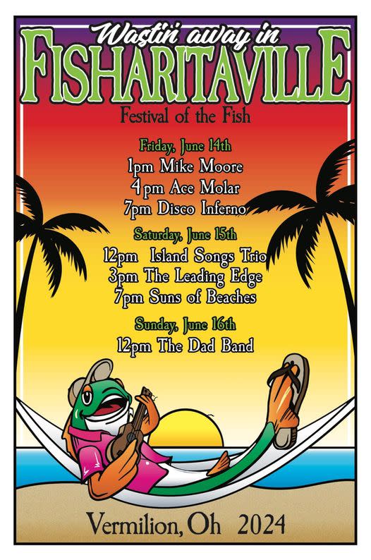 he Vermilion Chamber of Commerce and the Festival of the Fish Committee is pleased to announce the 2024 Festival of the Fish theme “Wastin’ away in Fisharitaville” A Jimmy Buffett tribute! Join us for the Festival of the Fish June 14th-16th! Always held over Father’s Day weekend and we are celebrating 58 years in 2024! Get ready to reel in the excitement with three days filled with fish, live entertainment, waterfront fun! Don't miss out on this fin-tastic event! Save the date and make a splash with us at Lake Erie! www.vermilionohio.comSponsors