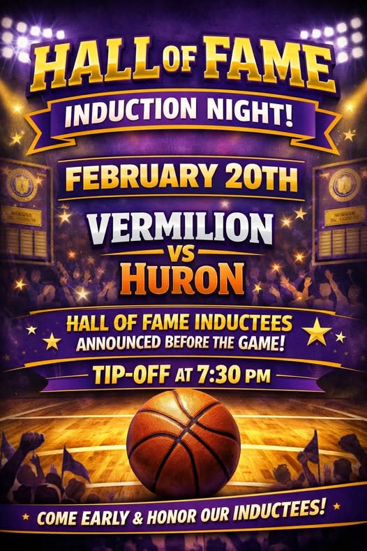 Join us February 20th before the Vermilion vs. Huron basketball game for a special Hall of Fame induction ceremony! Inductees will be announced prior to tip-off, so be sure to come early and be part of the celebration. π’ Tip-off: 7:30 PM π Hall of Fame Induction: Pre-game ππ Boosters Concessions Featuring: Chick-fil-A, Crumbl Cookies, and all your concession favorites! Come hungry, come loud, and help us honor some of Vermilionβs best before a great night of basketball!