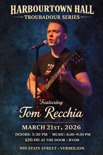 Featuring Bill Bourne $20 at the door BYOB π₯ Harbourtown Hall’s Troubadour Series is heating up! Catch Tom Recchia on Mar 21 unforgettable nights of music await! πΆ Solo musicians, your stage is calling! Harbourtown Hall is booking talented singer-songwriters, acoustic guitarists, and solo performers ready to wow an attentive, intimate audience. Bring your originals or killer covers and join the magic! β¨πΈ π 995 State Street • Vermilion, OH π Call or text 216-577-3555 or message them on their social media page Harbourtown Hall to book your spot!