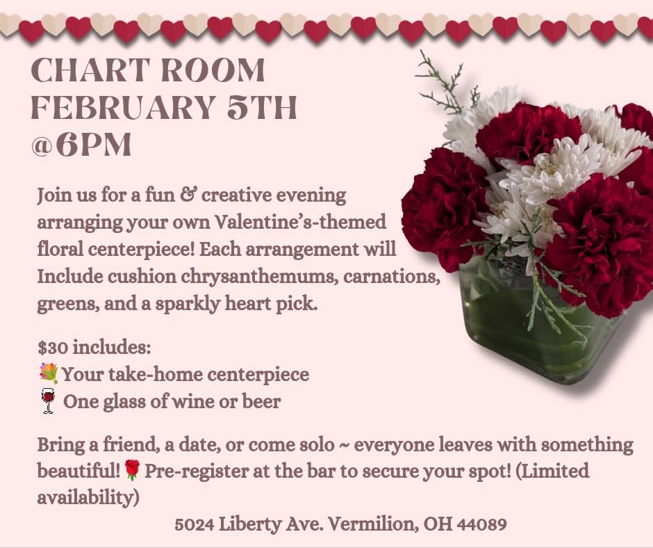 Join the Chart Room February 5th at 6:00 PM for a fun & creative evening arranging your own Valentine's themed floral centerpiece!! Pre register at the bar to secure your spot! $30 includes your take home centerpiece and a glass of wine or beerImages