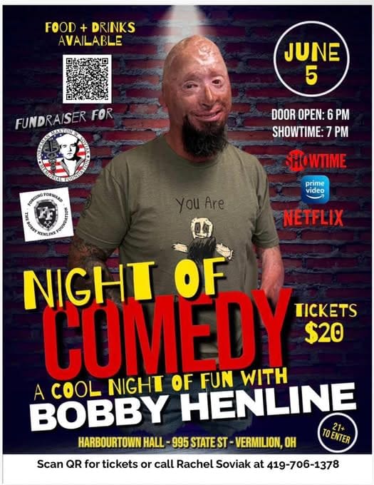 This is more than just a night of comedy, it’s a night that gives back. Join the community on June 5 at Harbourtown Hall for an unforgettable evening with Bobby Henline. Through laughter, strength, and storytelling, this event supports two incredible causes…the Corpsman Maxton W. Soviak Memorial Foundation and the Bobby Henline Foundation both dedicated to honoring service, supporting veterans, and making a lasting impact. It’s a chance to come together, share some laughs, and stand behind those who have sacrificed so much for others. Come out, show your support, and be part of something truly meaningful. 📍 Harbourtown Hall, 995 State St, Vermilion, OH 🕕 Doors open at 6 PM | Showtime at 7 PM 🎟 Tickets: $20 📞 Call Rachel Soviak at 419-706-1378 for tickets or scan the QR code on the flier.Images
