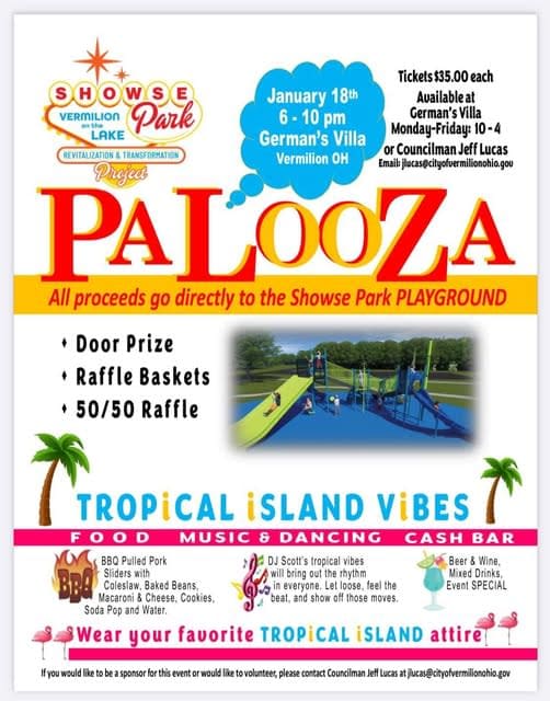 🌴🎉 Get ready for the ultimate tropical escape in Vermilion! 🎉🌴 Join the Showse Vermilion on the Lake Park Revitalization & Transformation PROJECT PALOOZA on January 18th from 6-10 PM at German’s Villa! For just $35 a ticket, you’ll enjoy: 🌴 Island Vibes with DJ Scott spinning tropical beats 🍹 Cash Bar featuring beer, wine, and tropical mixed drinks 🍴 A delicious BBQ-inspired feast with pulled pork, sliders, baked beans, mac & cheese, coleslaw, and cookies 🎟️ Plus: 🎁 Door Prizes 🎉 Raffle Baskets 💰 50/50 Raffle All proceeds go directly toward the Showse Park Playground—help make it amazing for our community! Grab your tickets now at German’s Villa (M-F, 10-4) or through Councilman Jeff Lucas (jlucas@cityofvermilionohio.gov). 🩴 Don’t forget to wear your favorite tropical island attire and bring your best dance moves! Let’s turn up the heat this January and support a great cause. 🌺🎶