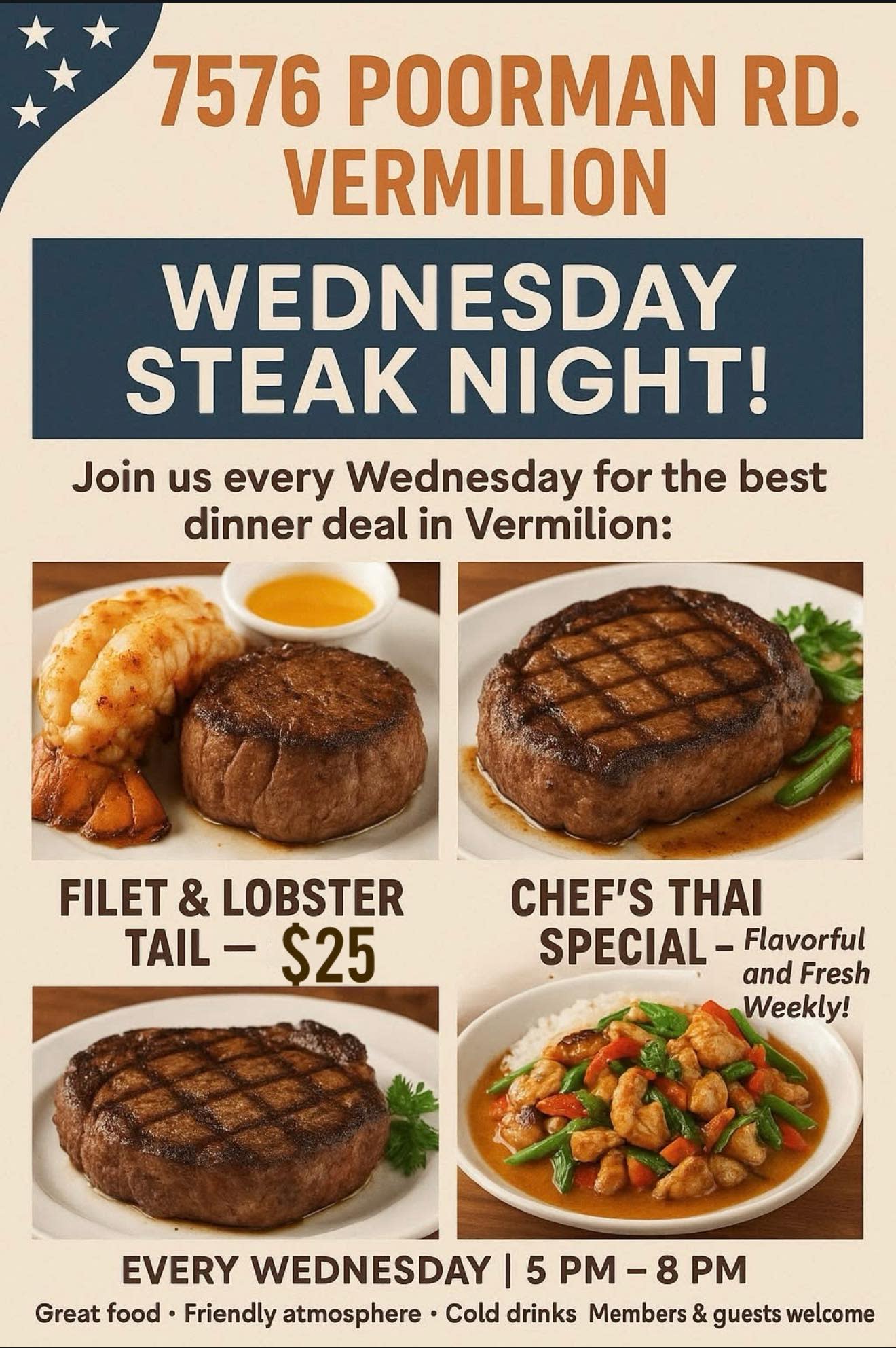 🔥 Wednesday just got delicious at Holland-Bond VFW Post 7576! 🔥 Head out to Poorman Rd in Vermilion for Steak Night, where the filet & lobster tail steals the show for just $25! Or spice things up with the Chef’s Thai Special, bursting with fresh flavor every week. 🥩🦞🌶️ 🍻 Great food, friendly faces, and cold drinks, what more could you want midweek? Every Wednesday | 5–8 PM | Members & guests welcome!