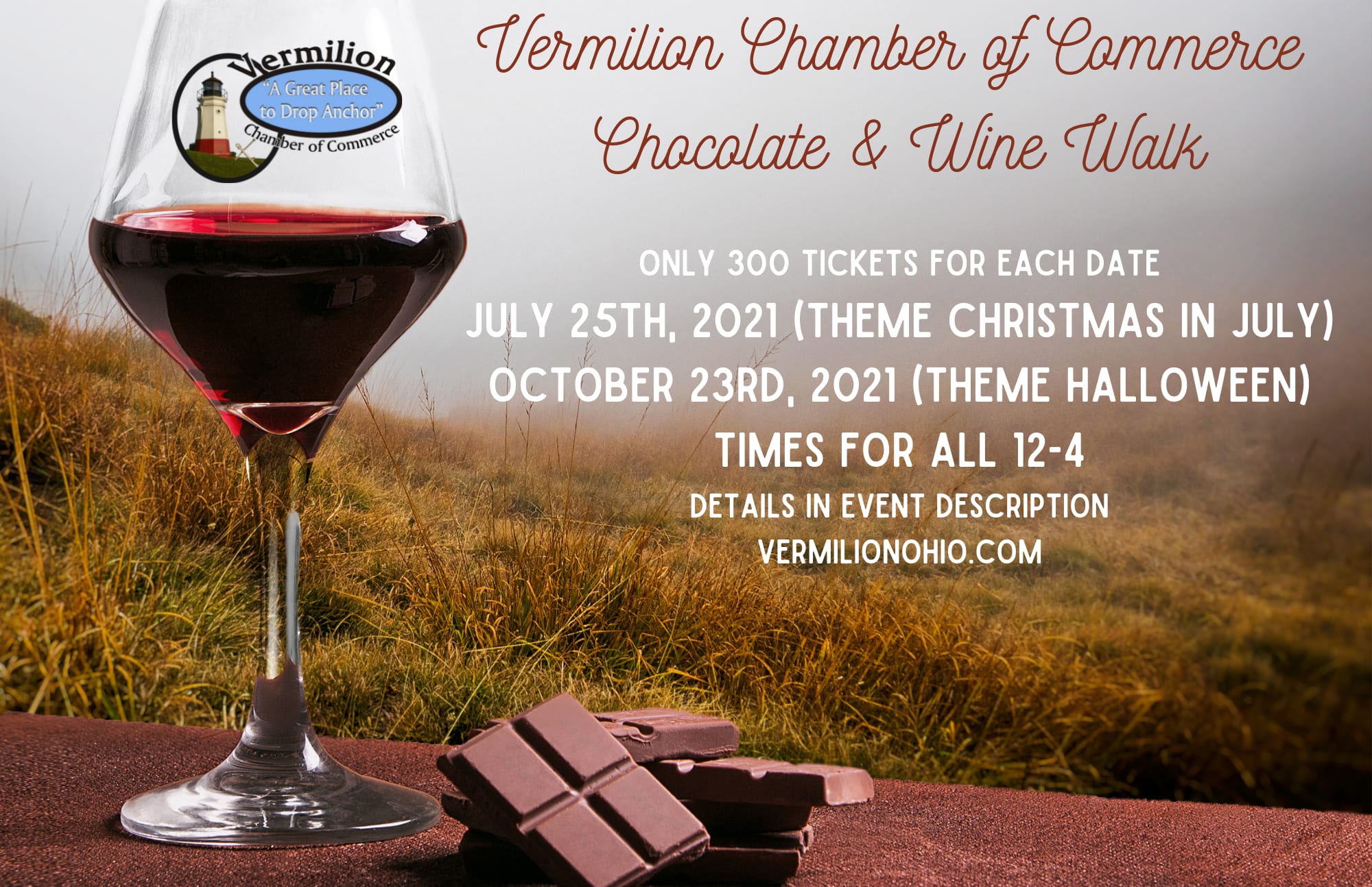 July 25th, 2021 Noon - 4PM Come Shop, Wine and Dine, and Explore in Downtown Vermilion Ohio. Join us for the Vermilion Chamber of Commerce Chocolate and Wine Walk. We will have limited tickets available. There will be 3 dates available to purchase tickets, all tickets sales are final we will not be able to swap dates or issue refunds. We hope you can join us for this wonderful Annual Event.