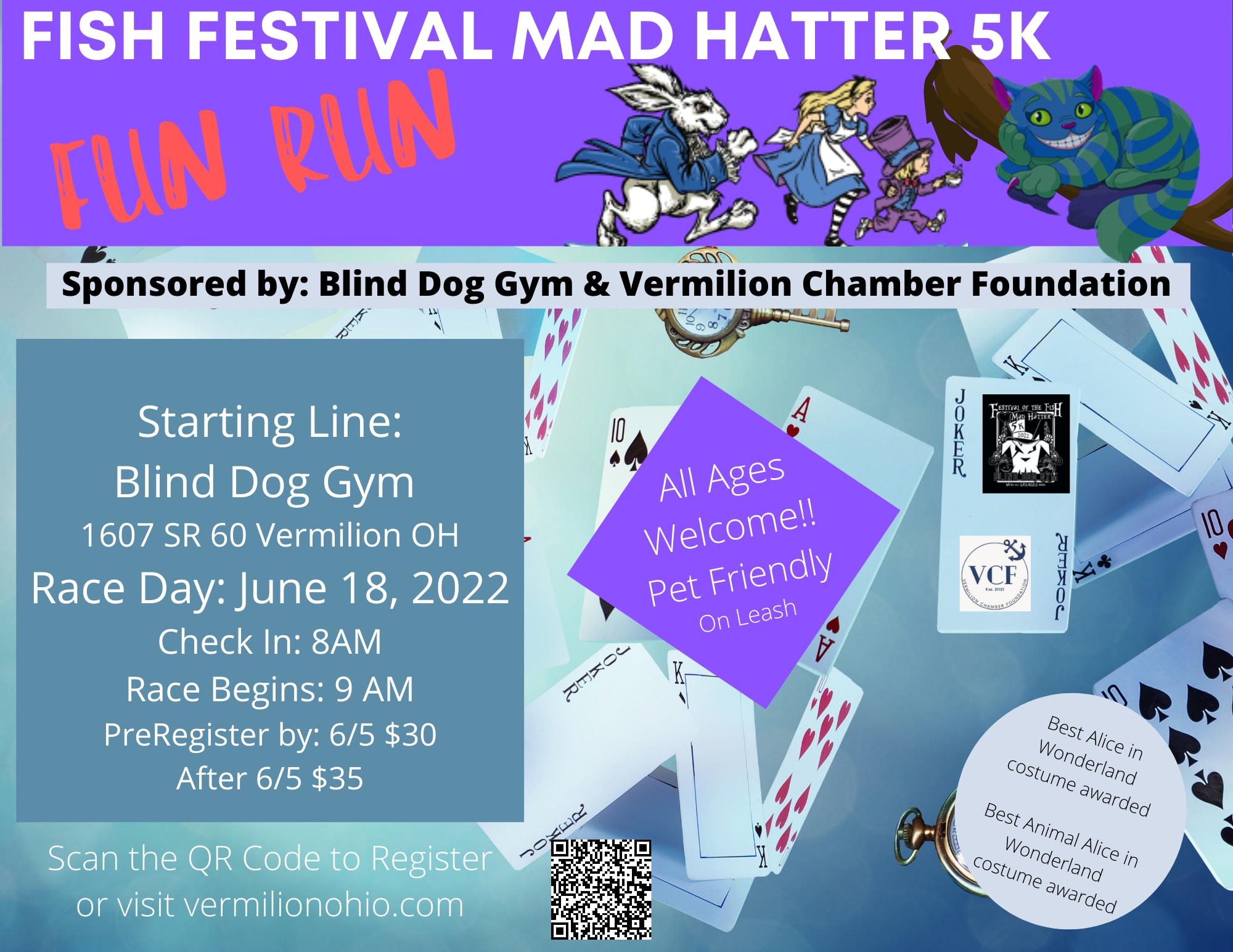 Run down the rabbit hole at the Festival of the Fish as Blind Dog Gym & The Vermilion Chamber Foundation Present: The Mad Hatter 5k Fun Run 'Theme Alice in Wonderland' Starting Line will be at the Blind Dog Gym: 1607 State Route 60 Building E Suite 52, Vermilion OH 44089 Race Day: June 18, 2022 Check-in: 8 AM Race Begins: 9 AM Pre Registration by 6/5 - $30 Registration after 6/5 $35 (t-shirt sizes will be limited after 6/5 and on race day) So register early! All Ages welcome! Pet friendly on a leash, please! Best Alice in Wonderland Costume awarded to Human and Animal! Every Human that registers gets a T-Shirt and an Official 5K Medallion. Remember this is a fun run!! So have fun and enjoy the bragging rights as we will be recording time! Water & Snacks will also be providedSponsors