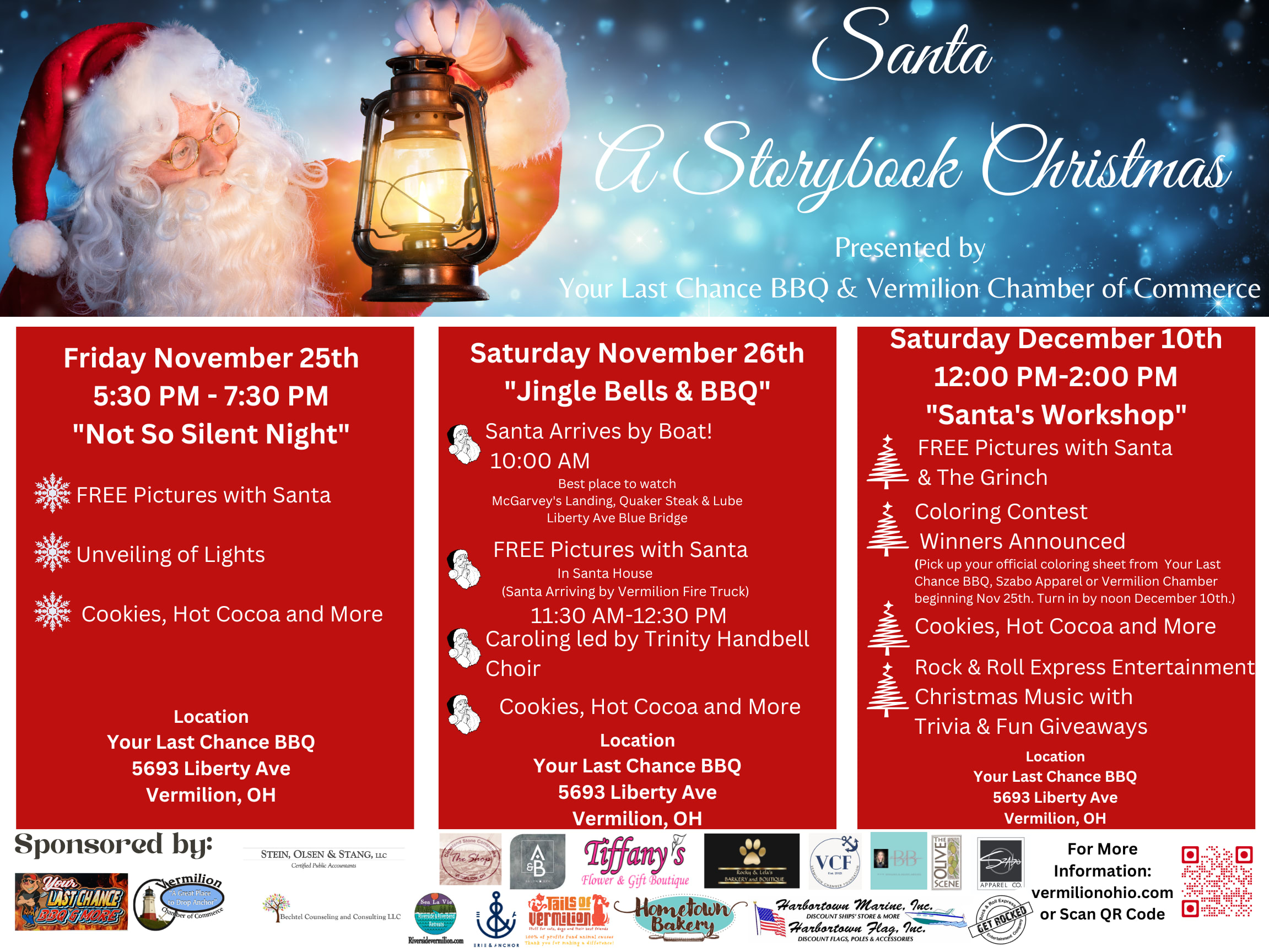 Santa will arrive by boat Saturday November 26th at 10:00AM!! Best place to watch. McGarvey's Landing, Quaker Steak & Lube, Liberty Blue Bridge. Then follow Santa in his special transportation for FREE Pictures in Santa's House at Your Last Chance BBQ 5693 Liberty Ave Vermilion OH 44089Sponsors